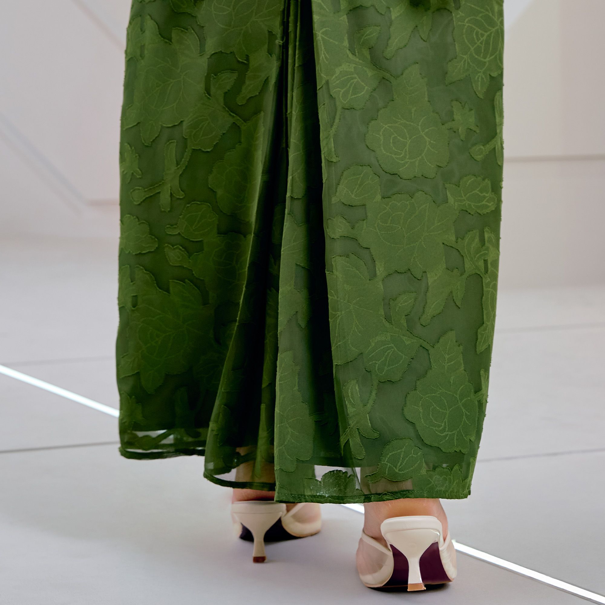 Modern Tailoring: A full-length skirt featuring a front slit for enhanced mobility and a contemporary edge.