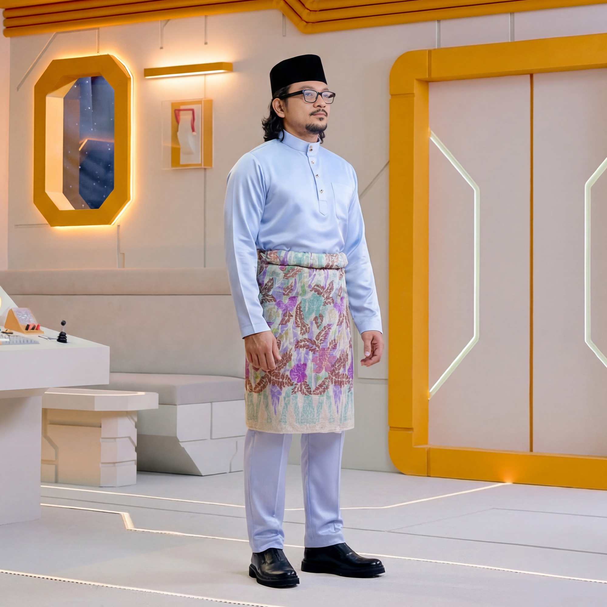 Cekak Musang collar with custom button detailing, no logo on shirt.