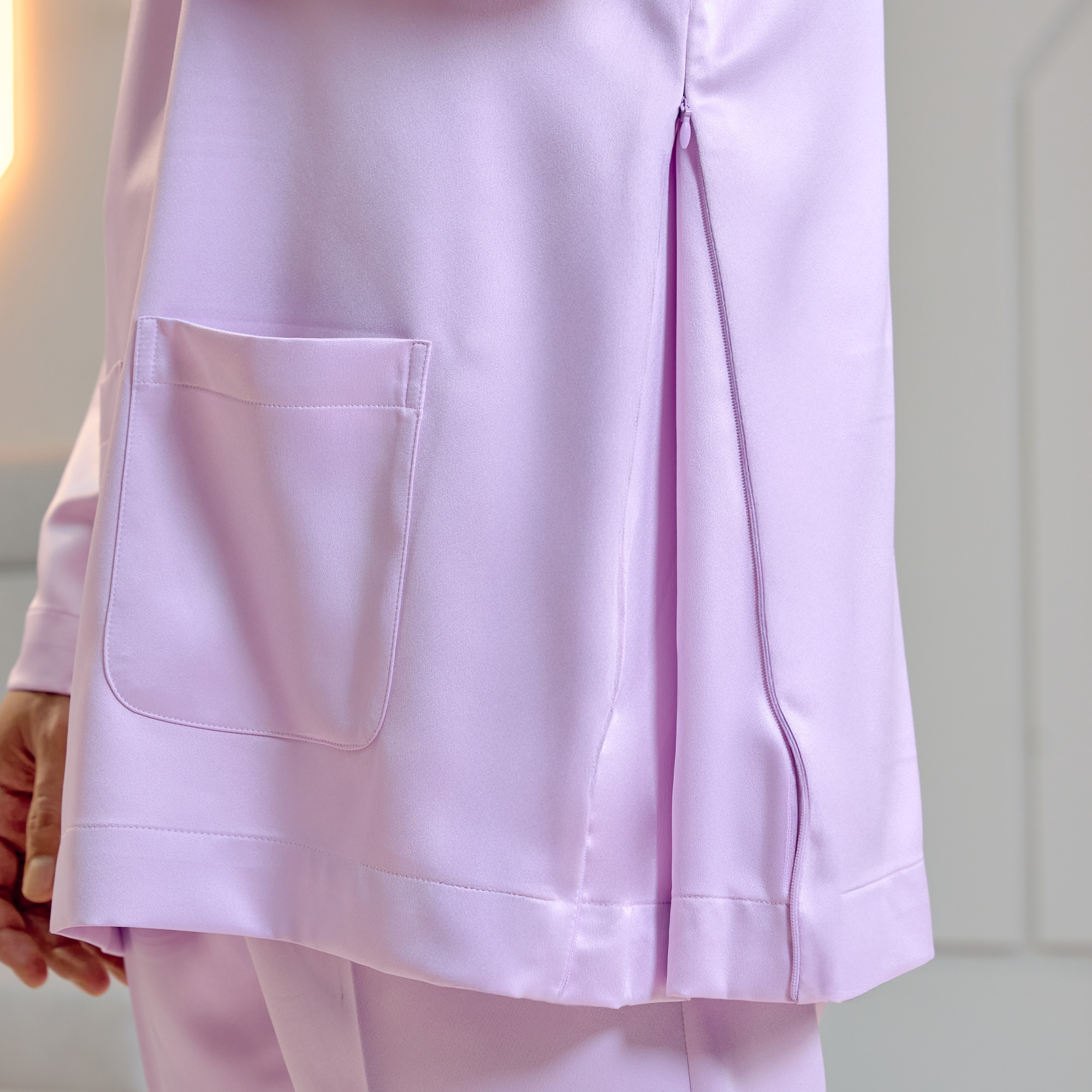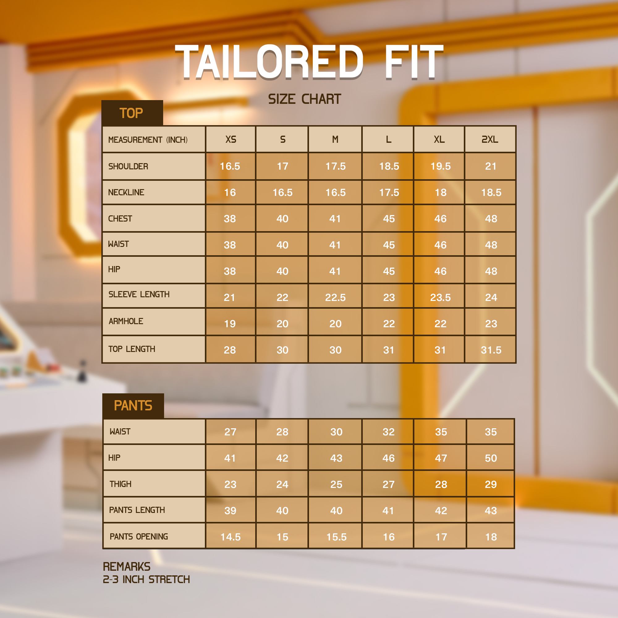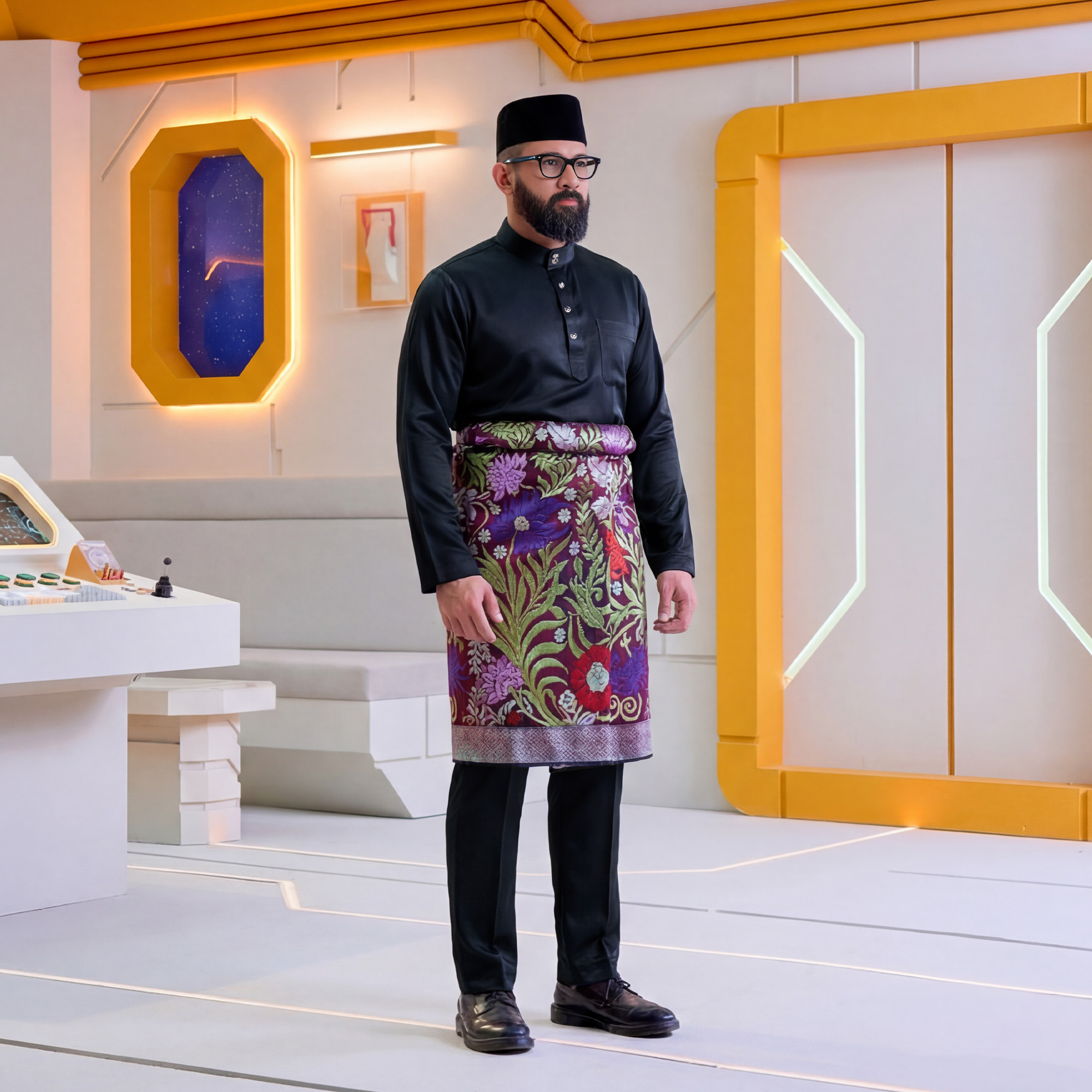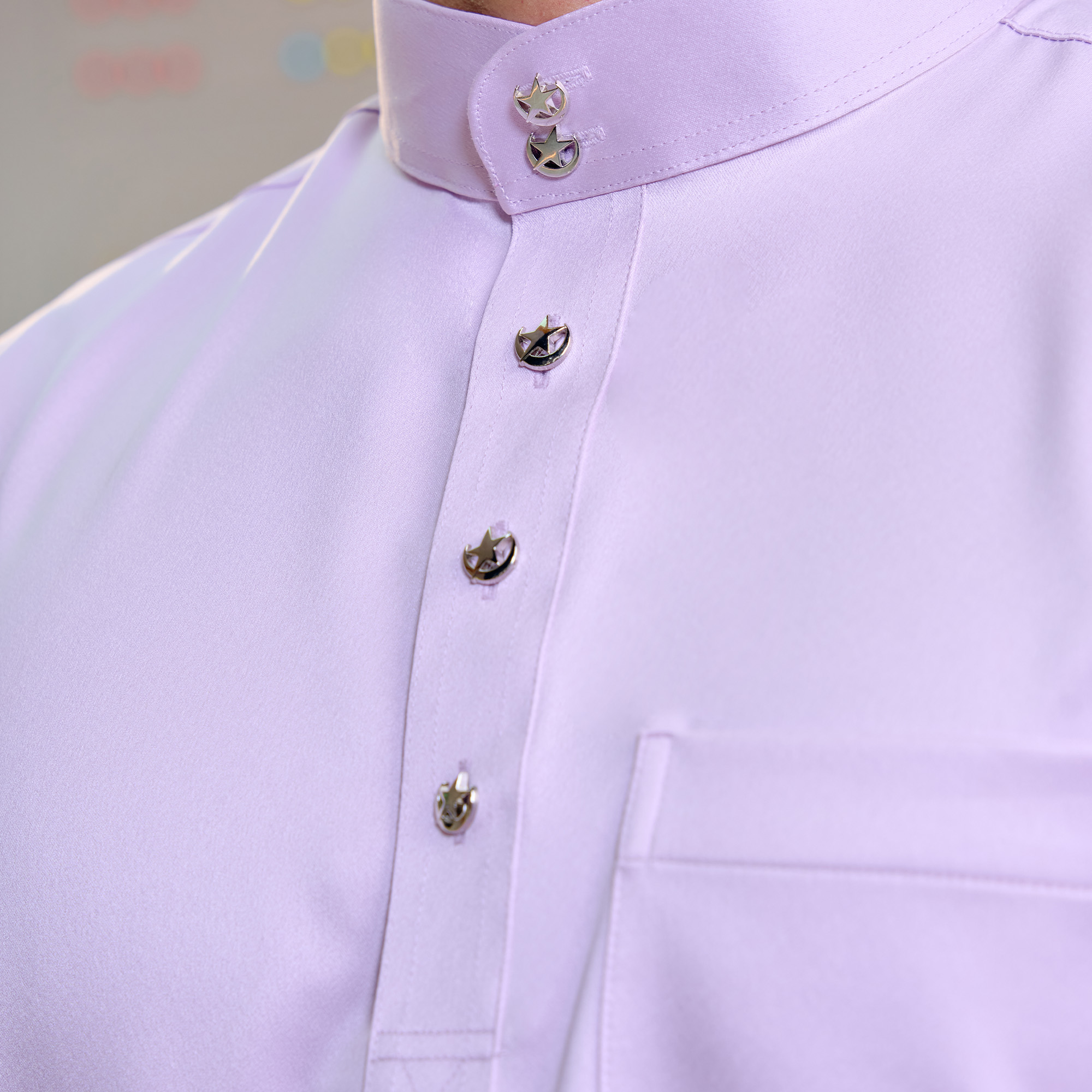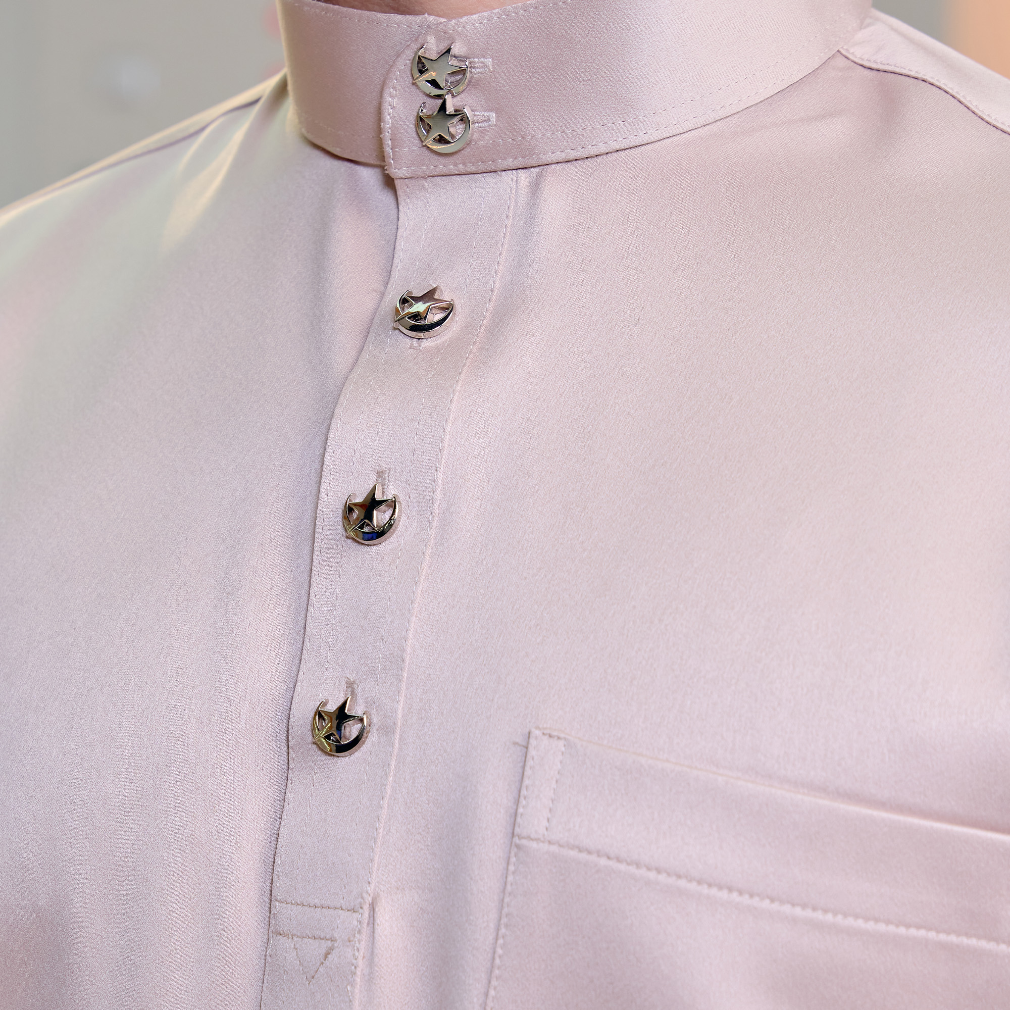 Cekak Musang collar with custom button detailing, no logo on shirt.