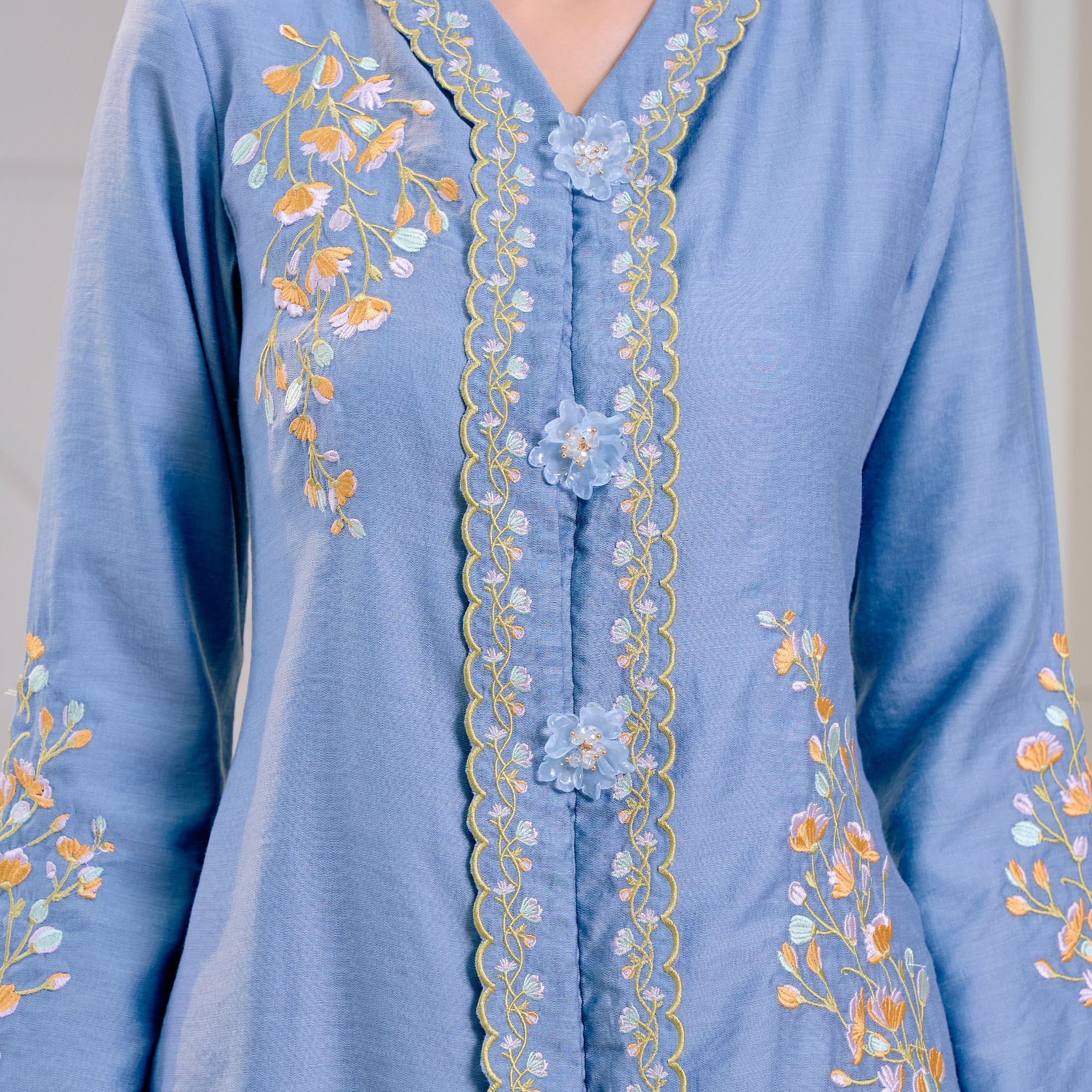Embellishments: Features intricate floral embroidery on the bodice and sleeves, accented with decorative dummy buttons along the front.