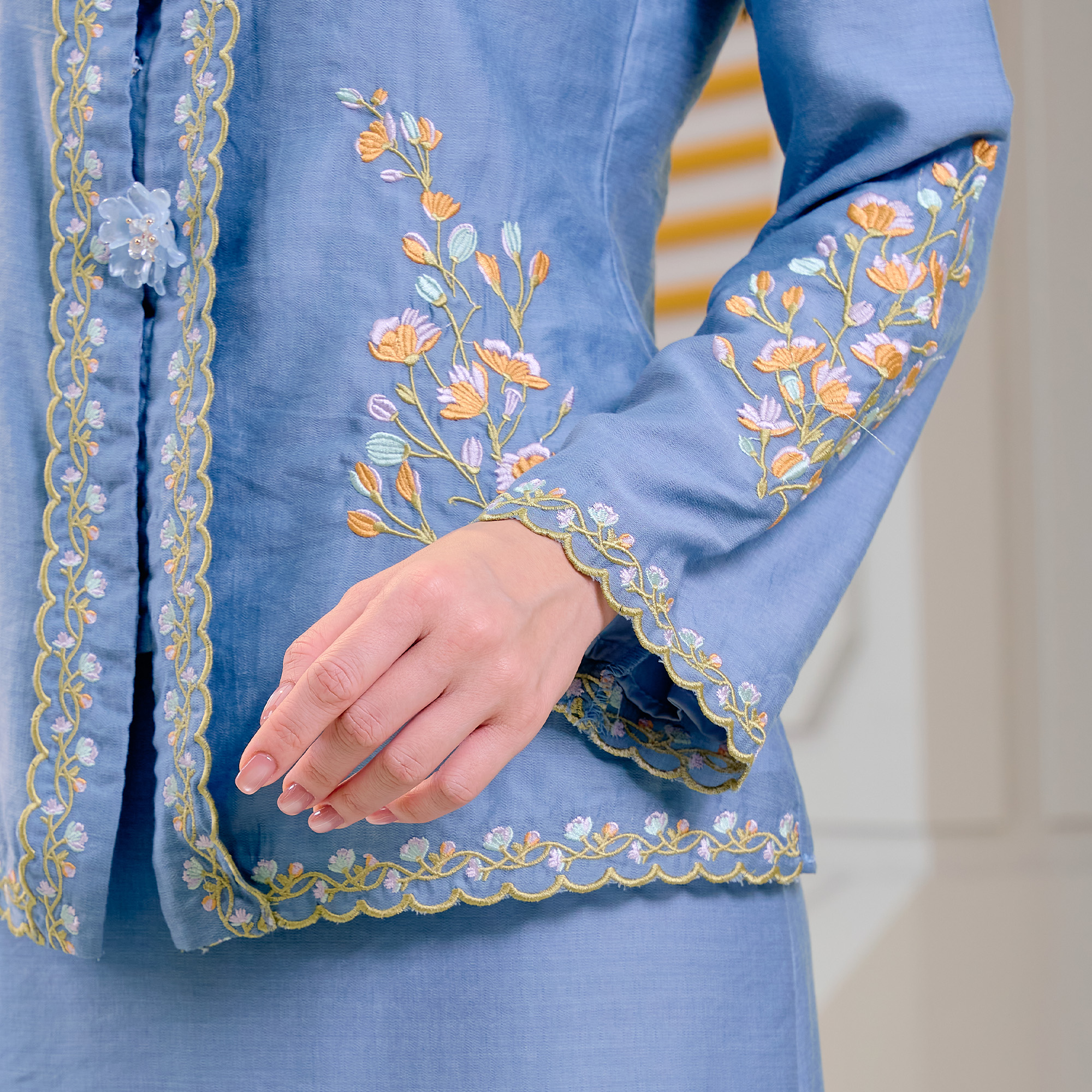 A classic Kebaya silhouette elevated with delicate floral textures and a timeless pleated finish.