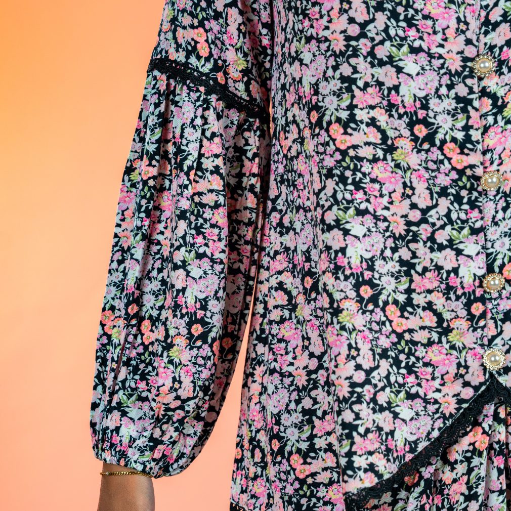 Puff sleeves with elastic at the wrist for a feminine finish and comfortable wear