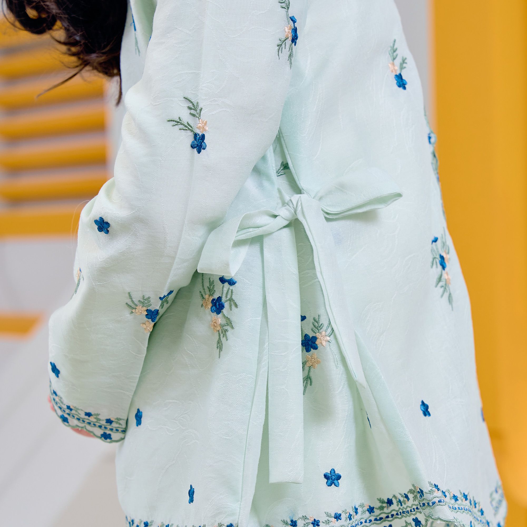 Whimsical Details: Includes the signature flower embroidery and ribbon ties on both sides.