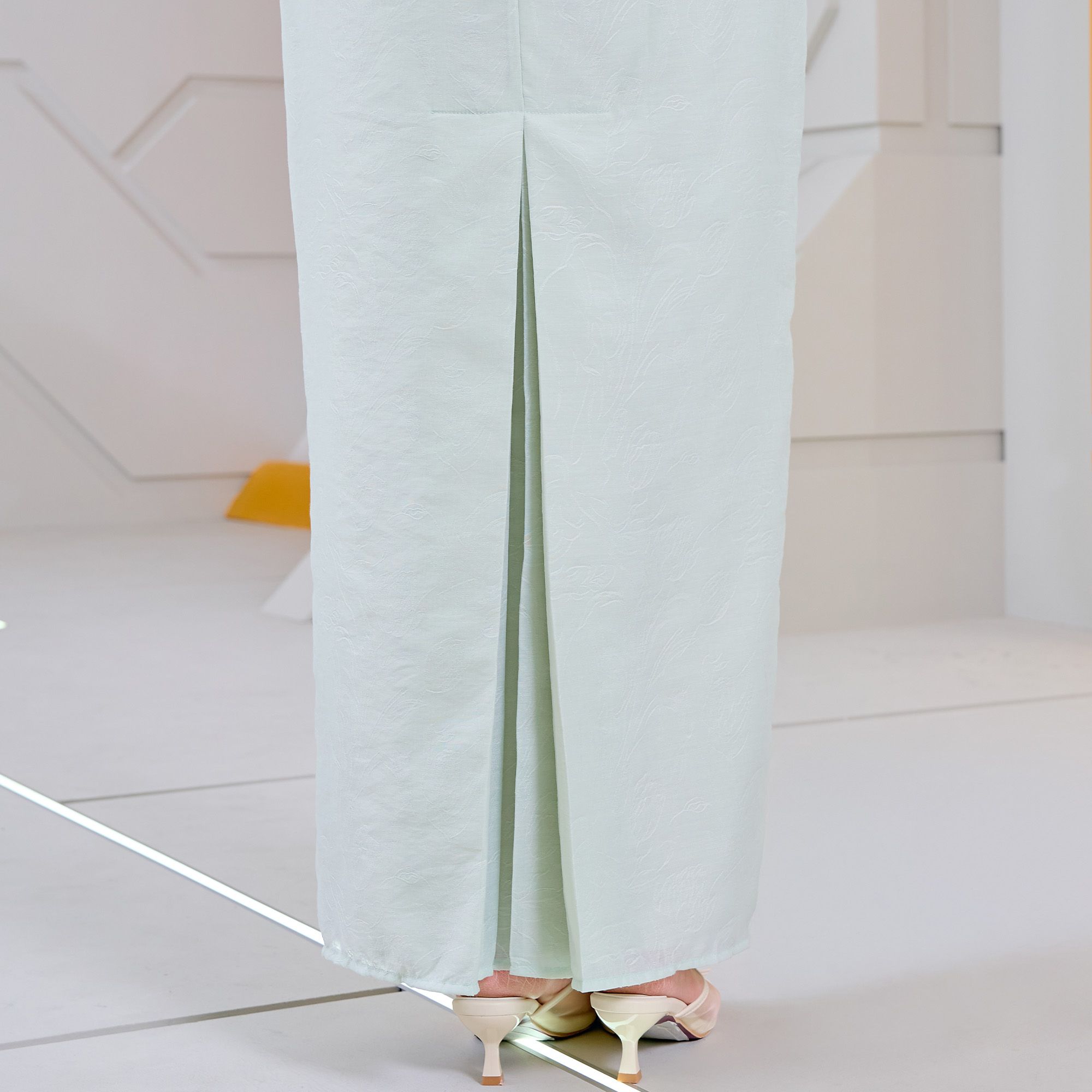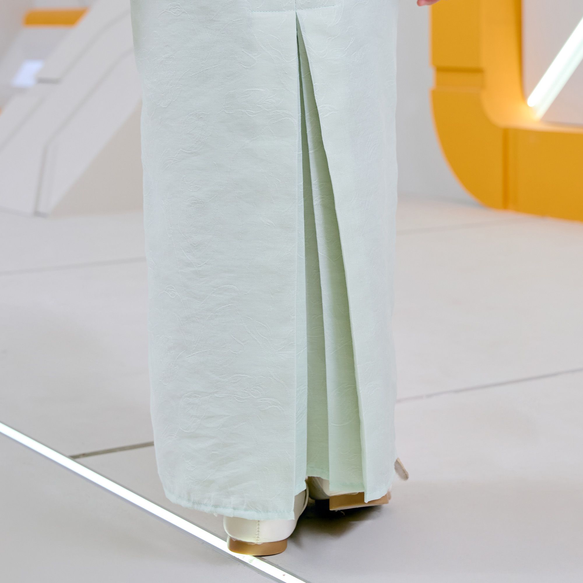 Structured Silhouette: A classic box pleated skirt that offers a sophisticated shape.