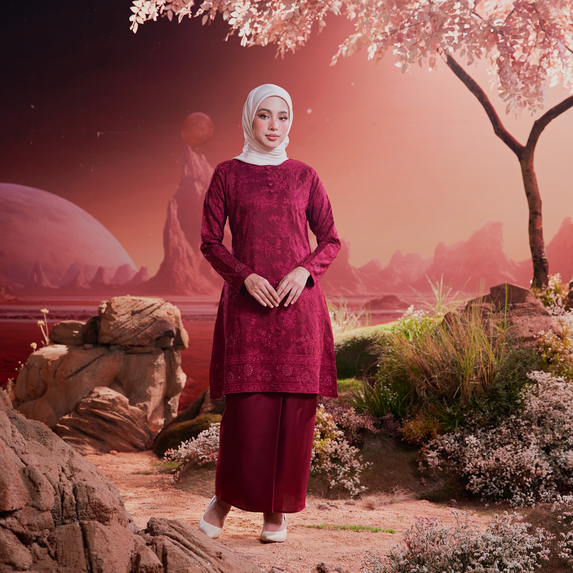 “Kebarung moden” refers to a modernized version of the traditional Malay kebaya and sarong ensemble. It typically features contemporary designs, fabrics, and embellishments while maintaining the essence of the traditional attire.